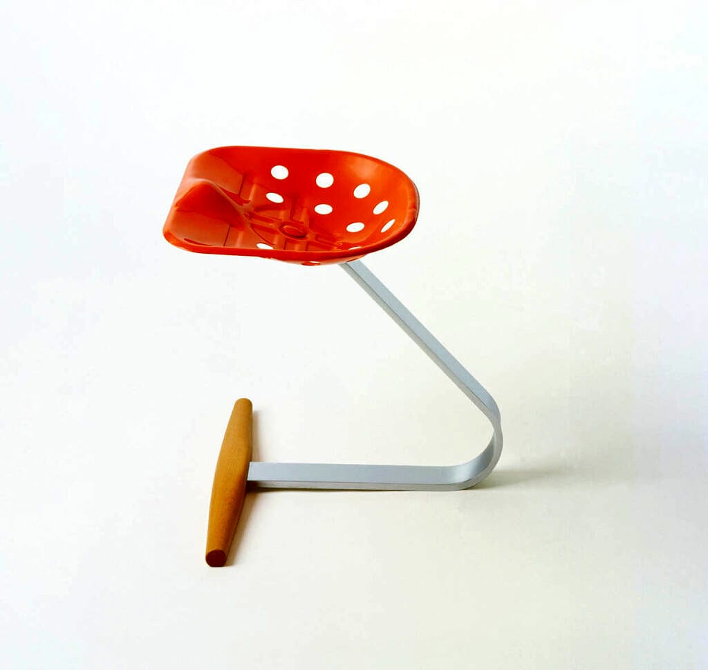 Livio Castiglioni left the practice in 1952. From then until Pier Giacomo died in 1968, Achille and worked as a team, exploring Marcel Duchamp’s concept of the “ready-made” by incorporating and repurposing existing objects into new designs. After the death of Pier Giacomo, Castiglioni worked alone.