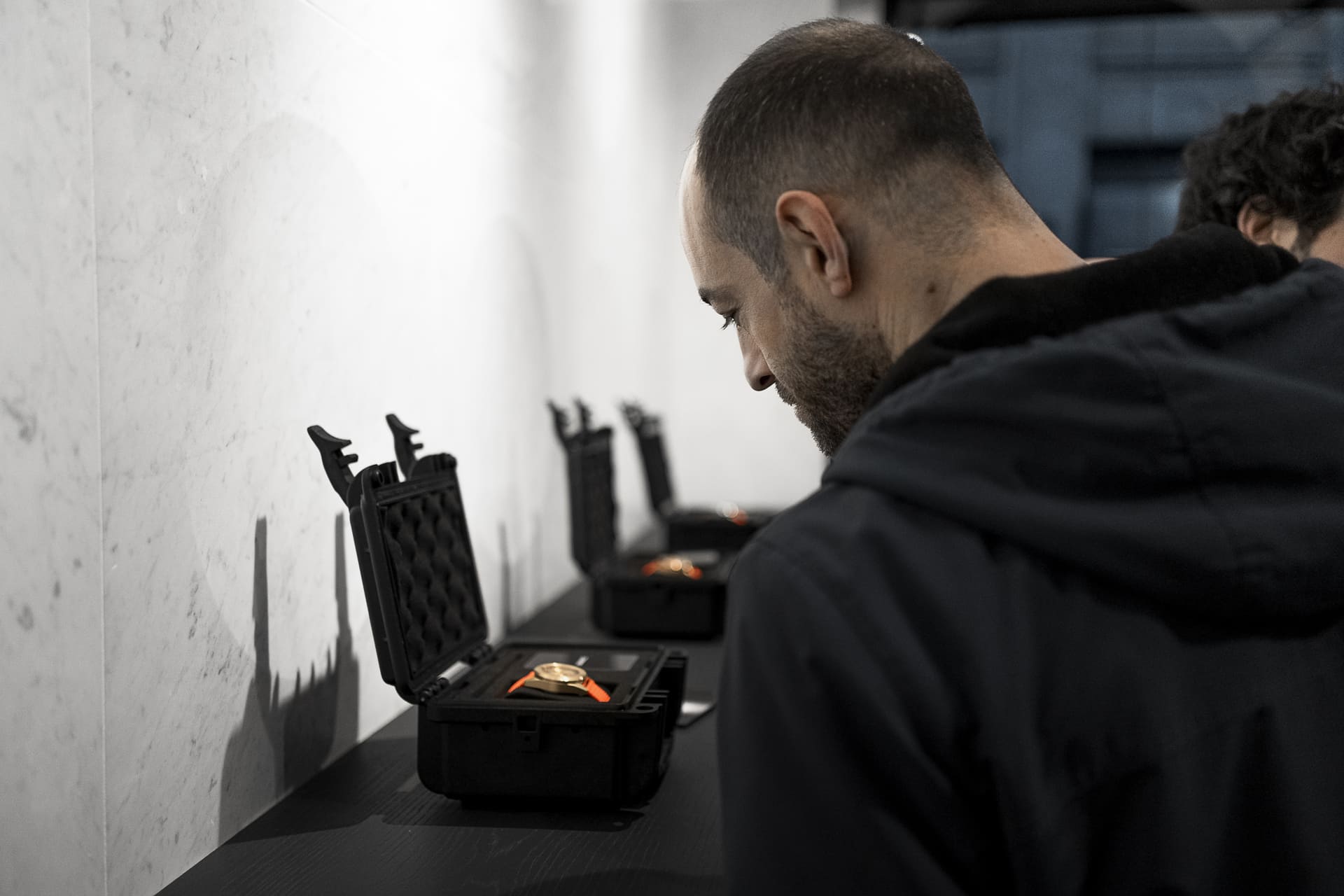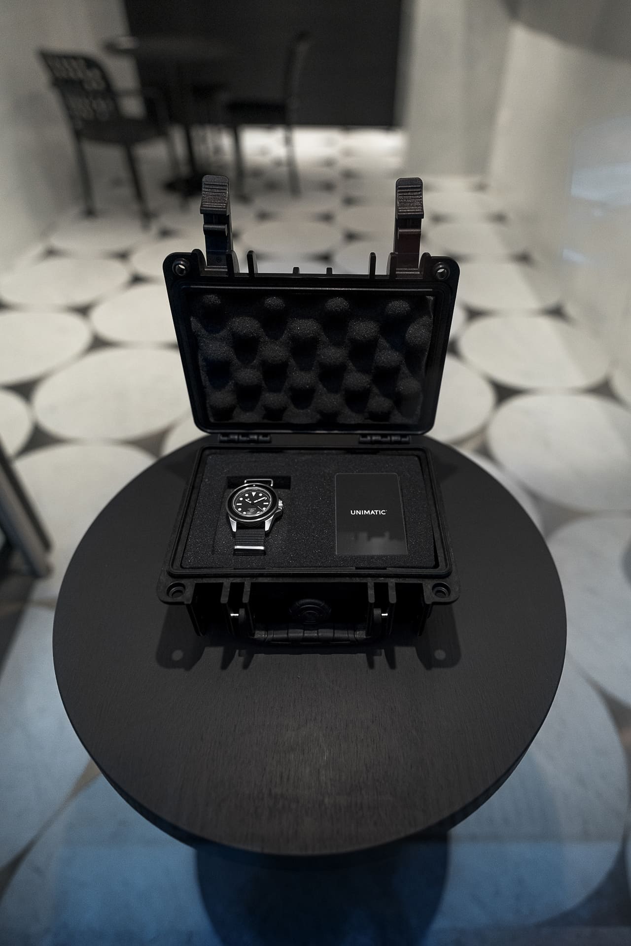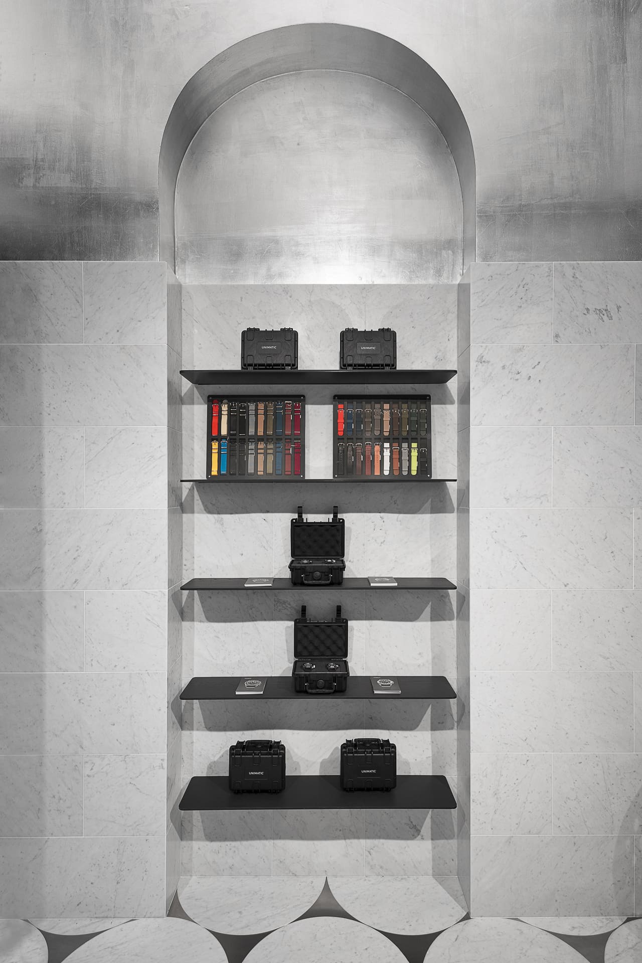 The leaf silver of the ceiling and the blackened wood furnishing are the perfect complements to the marble. The refinement and harmony of the three crafts combined results in the perfect backdrop for the Unimatic watches.” – Mårten Claesson, Eero Koivisto and Ola Rune, architects, April 2023