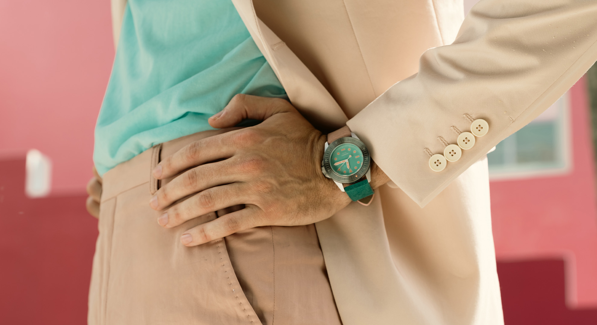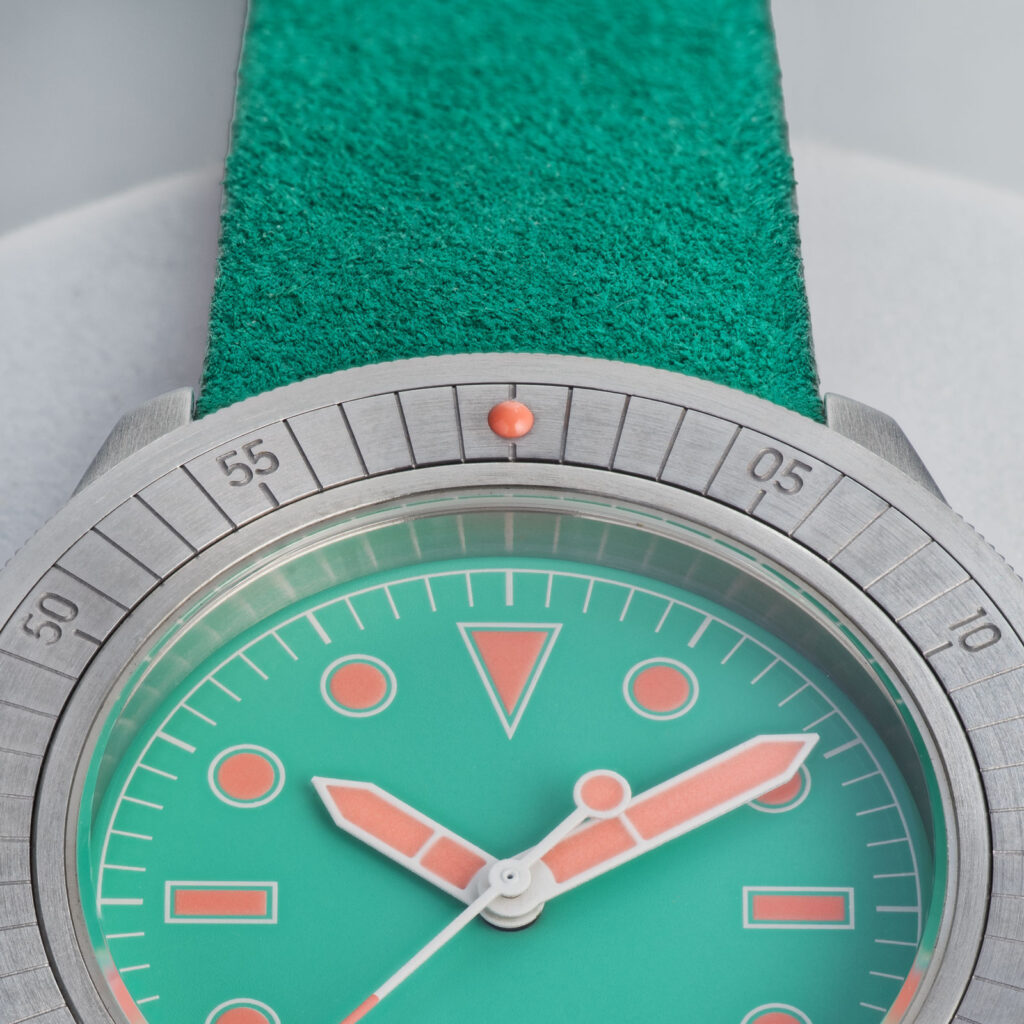 Featuring verde acqua and blush pink suede straps, this UNIMATIC Modello Uno reflects Miami’s tropical light and lively atmosphere.