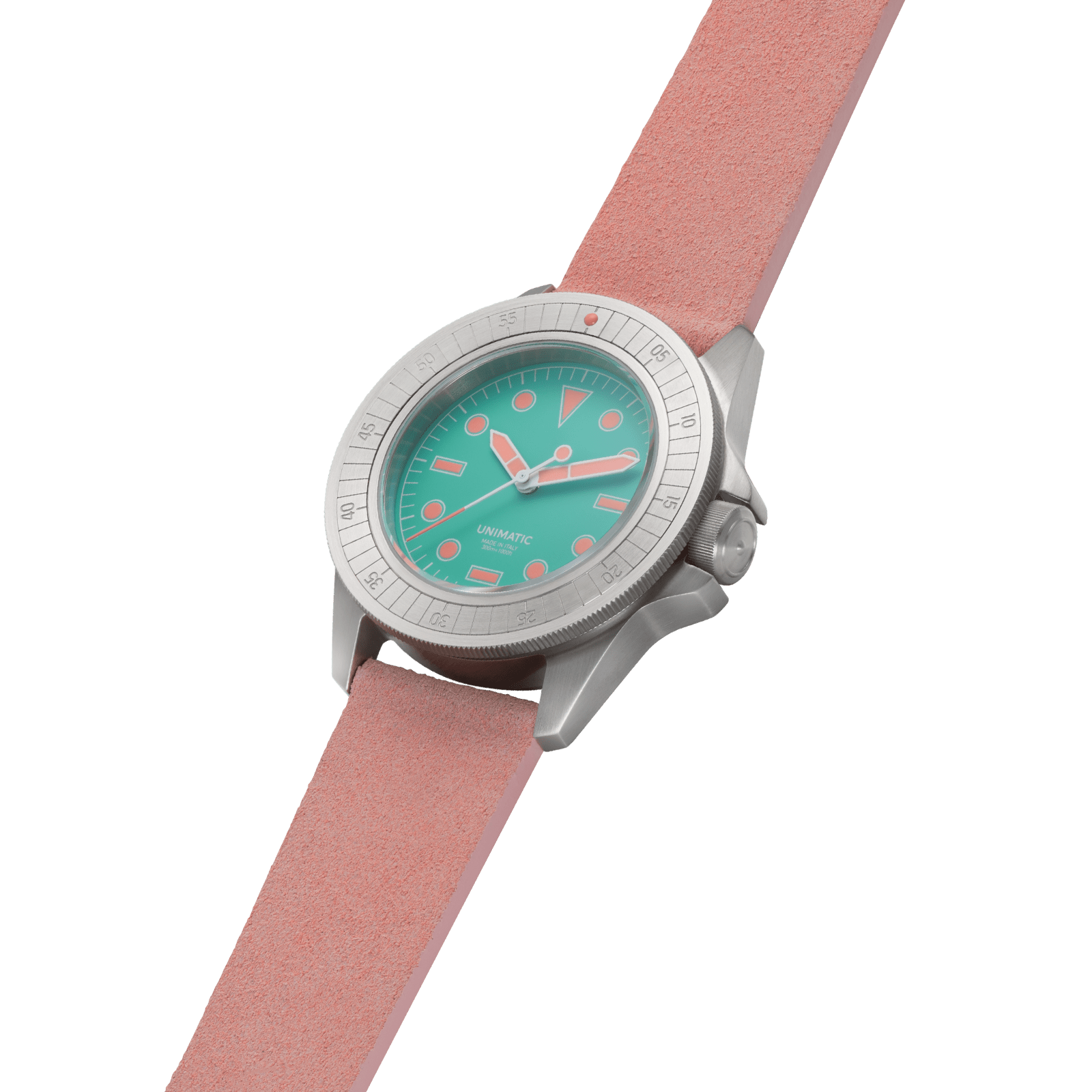 Featuring verde acqua and blush pink suede straps, this UNIMATIC Modello Uno reflects Miami’s tropical light and lively atmosphere.