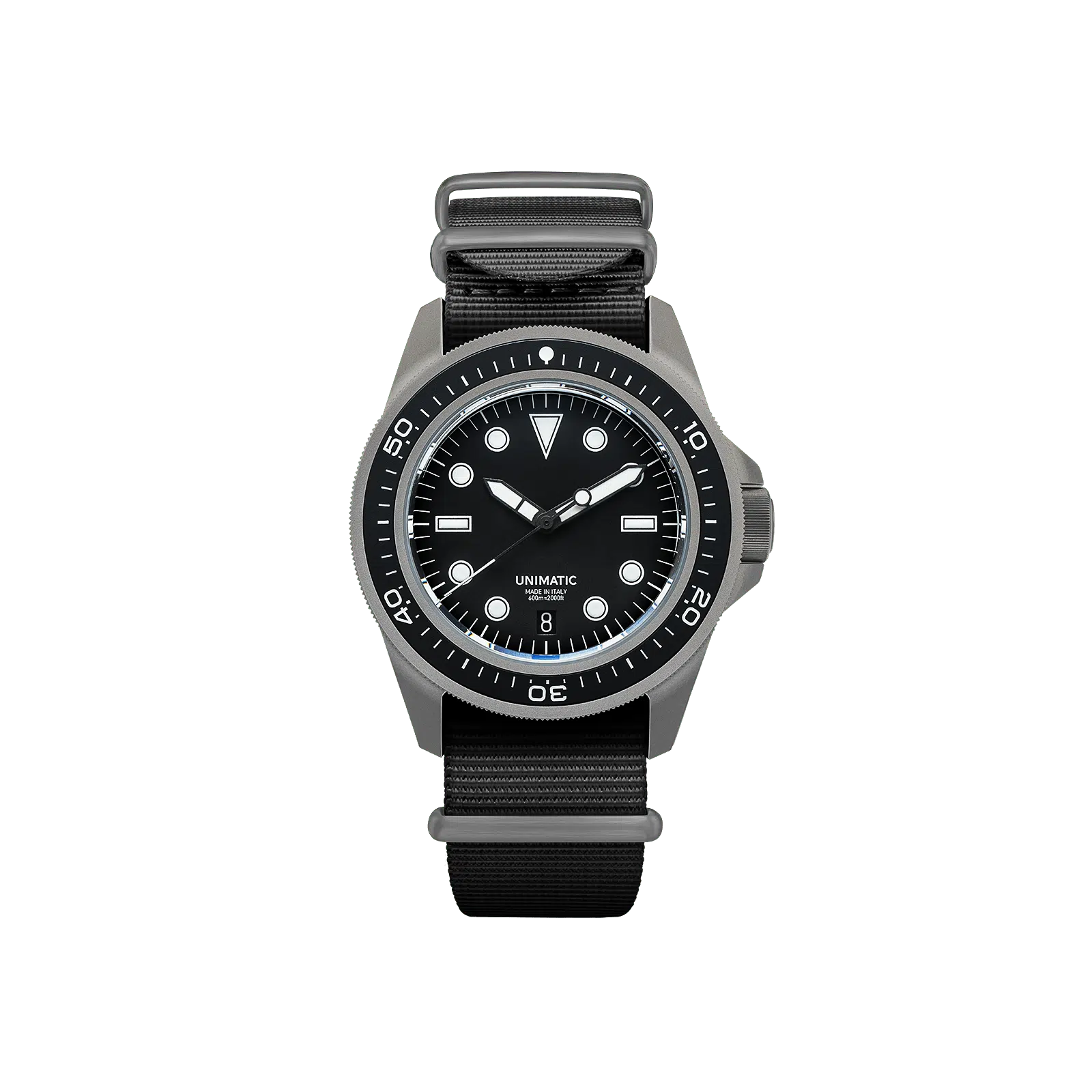 The black heavy-duty NATO strap features sandblasted titanium hardware signed UNIMATIC. Each piece is part of a limited edition of 300 units, individually numbered, and covered by a 24-month worldwide warranty.