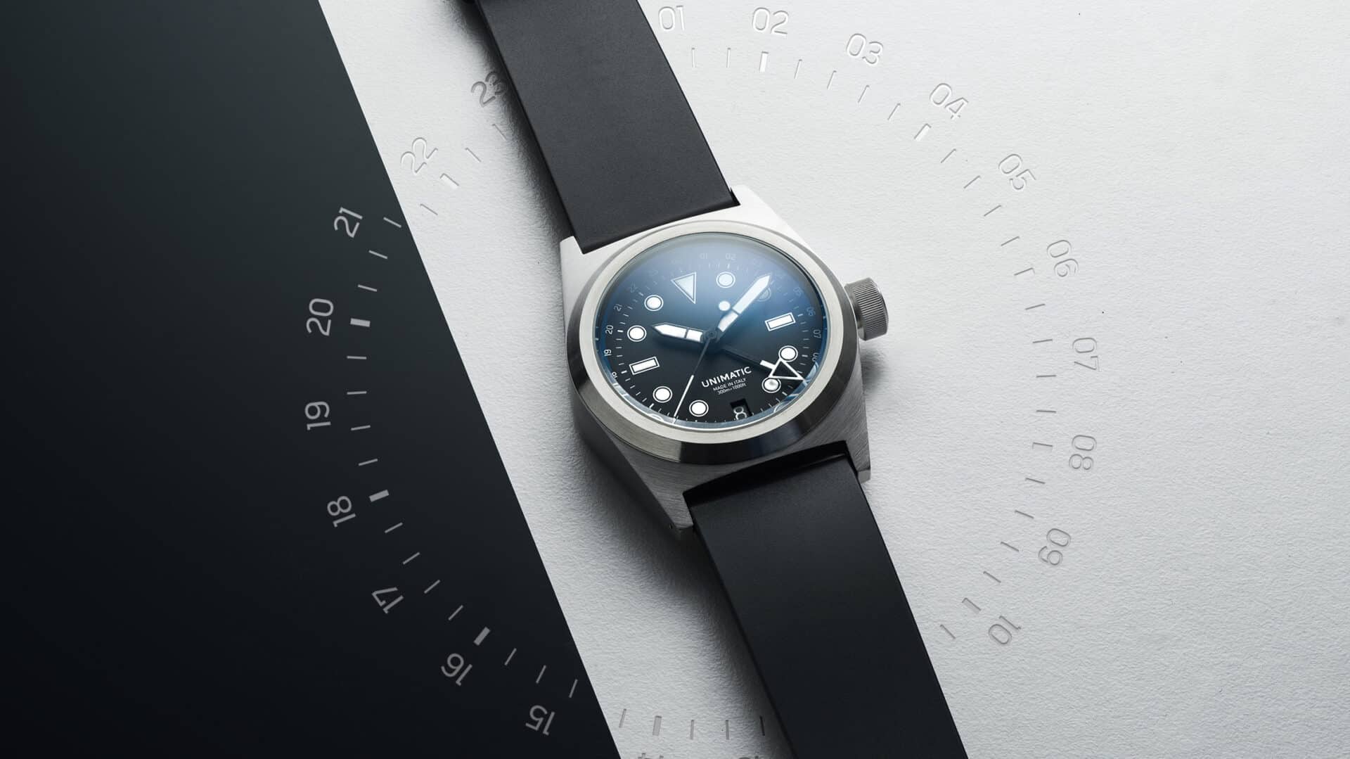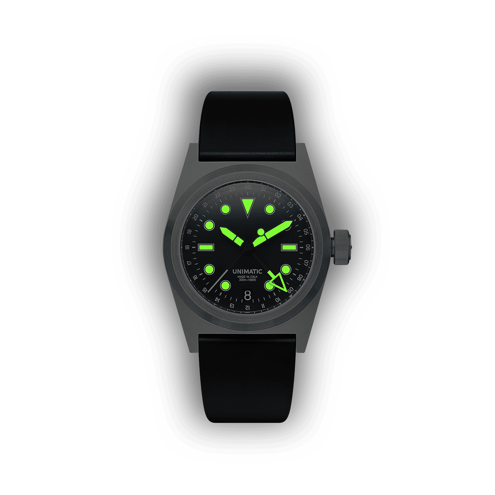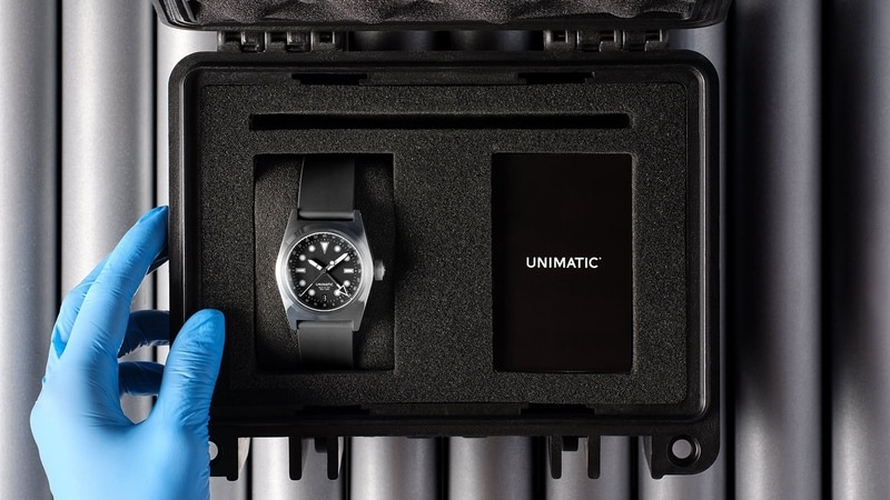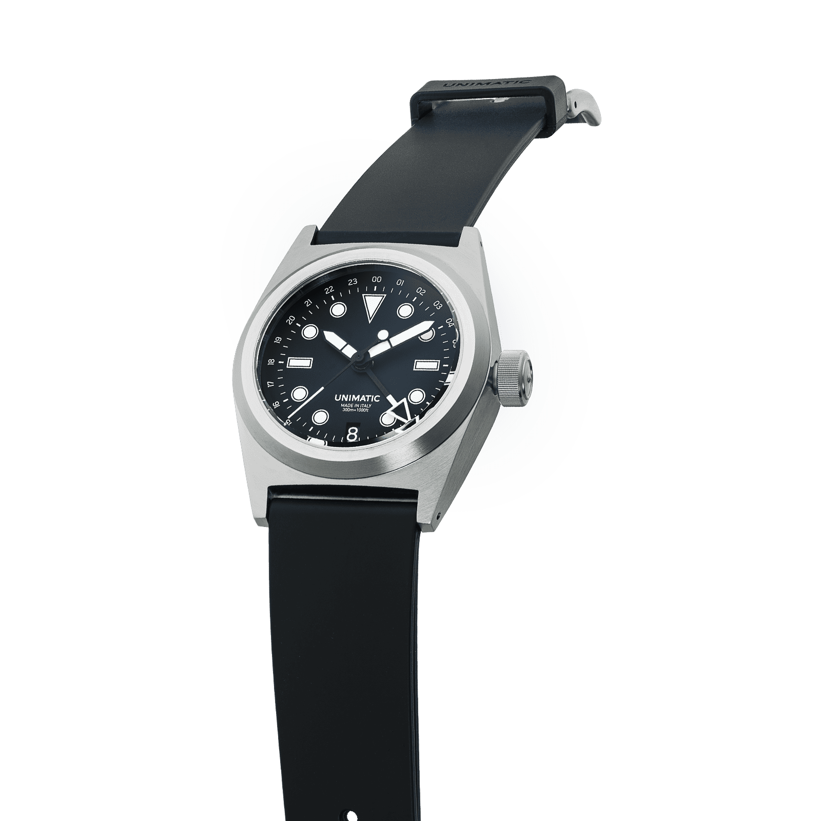 Inside, the NH34A automatic movement operates at 21,600 bph, with 41-hour power reserve and hacking second hand. The watch comes with a charcoal grey tapered 22-20mm TPU strap, stainless steel brushed hardware signed UNIMATIC, and quick-release system for easy strap changes.