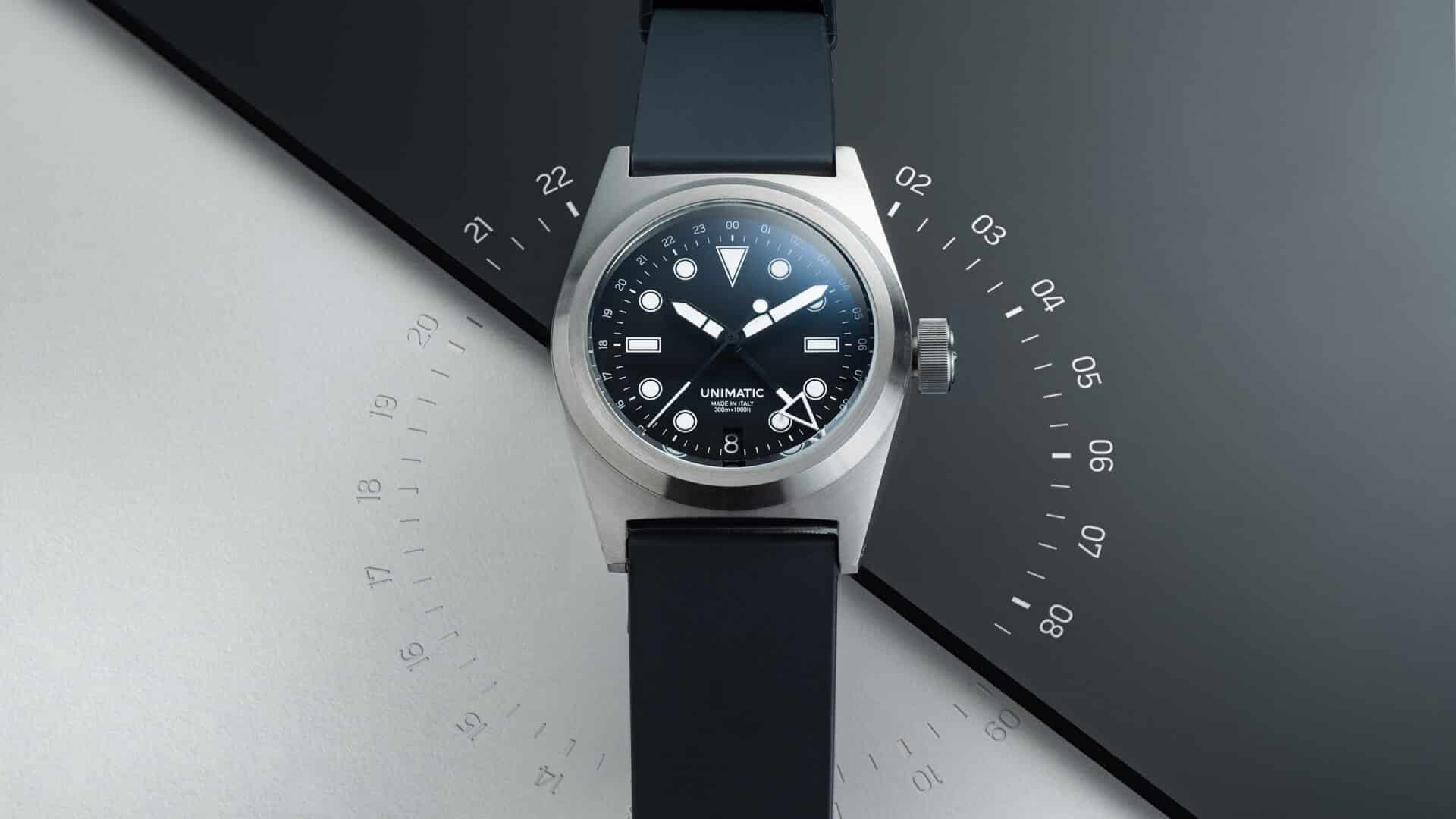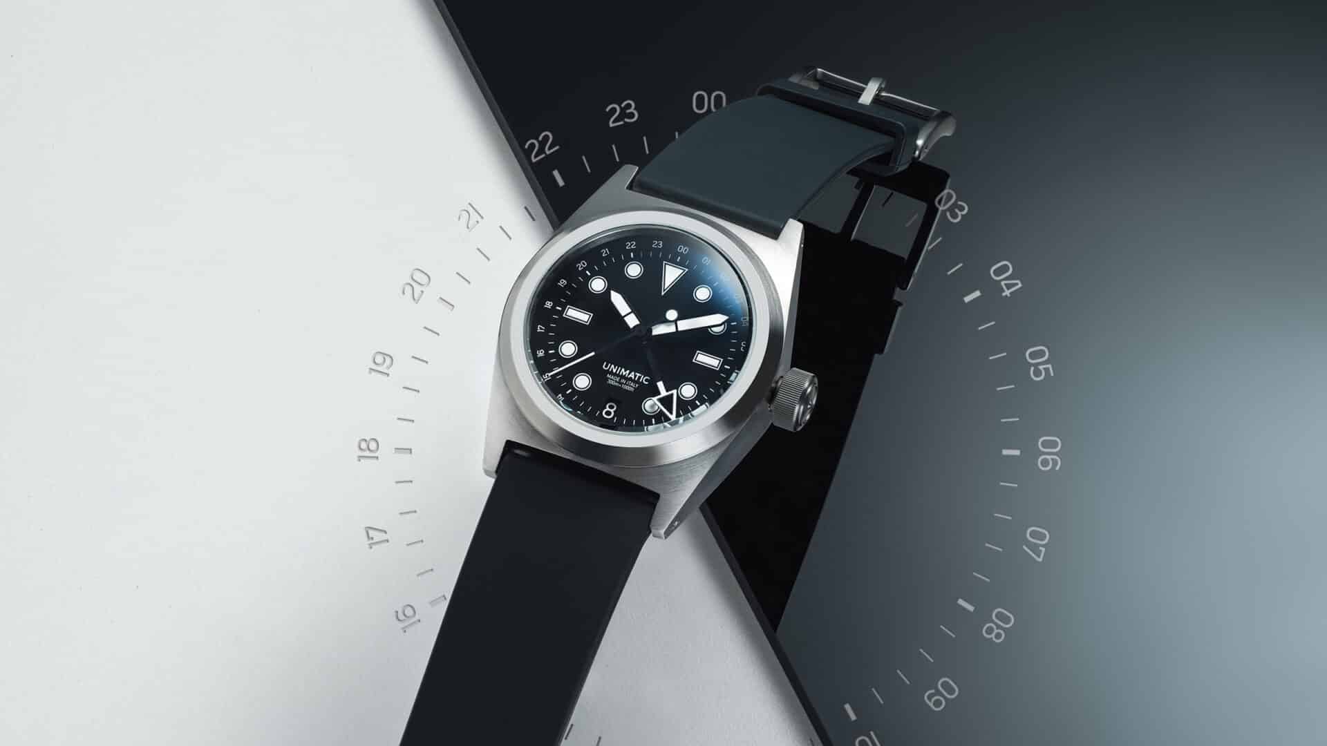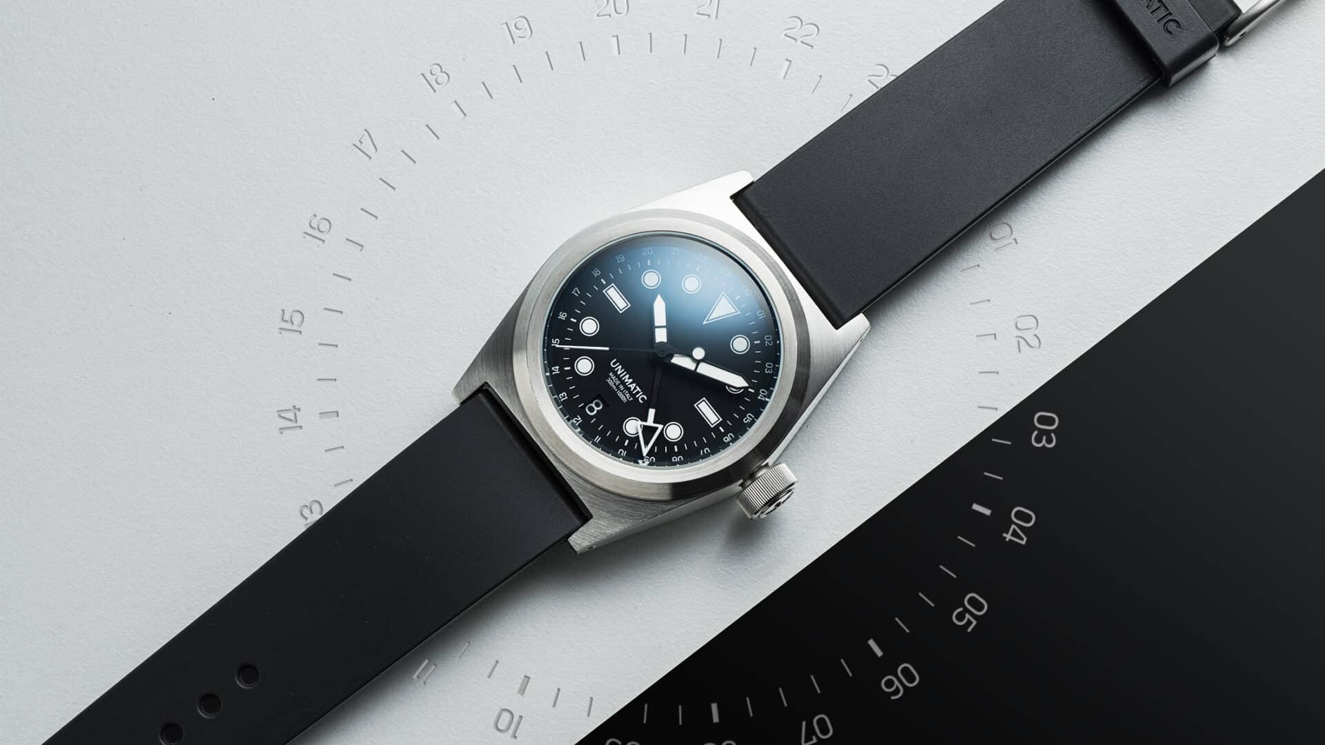 Inside, the NH34A automatic movement operates at 21,600 bph, with 41-hour power reserve and hacking second hand. The watch comes with a charcoal grey tapered 22-20mm TPU strap, stainless steel brushed hardware signed UNIMATIC, and quick-release system for easy strap changes.