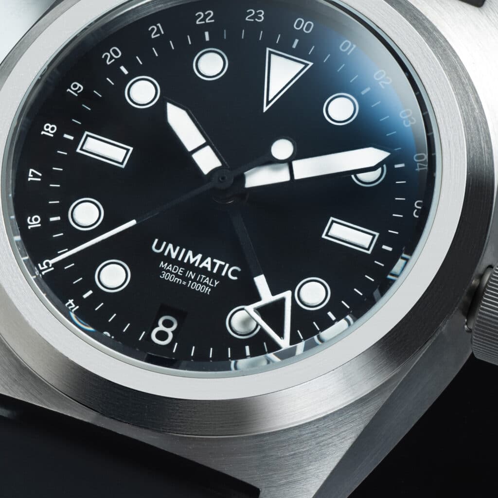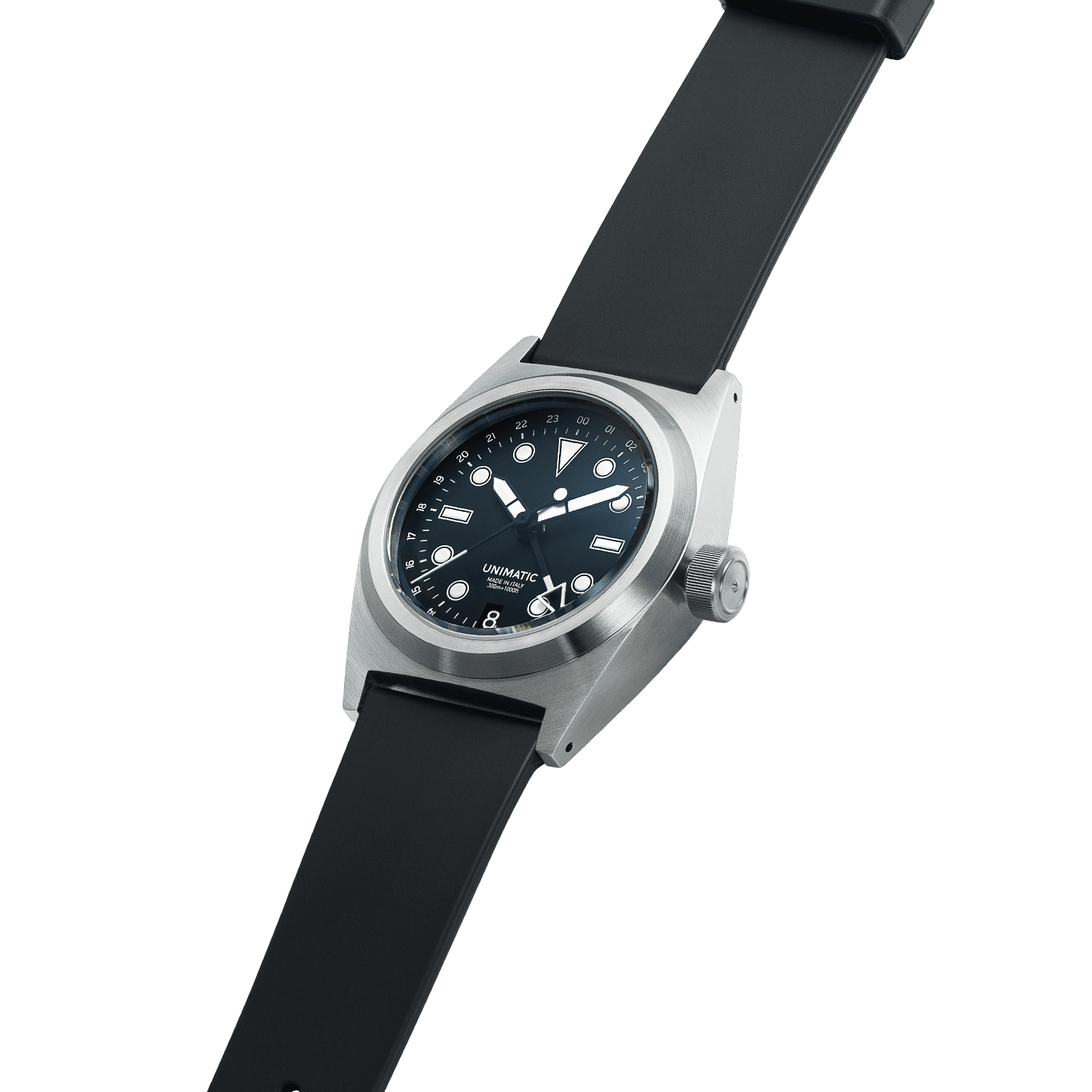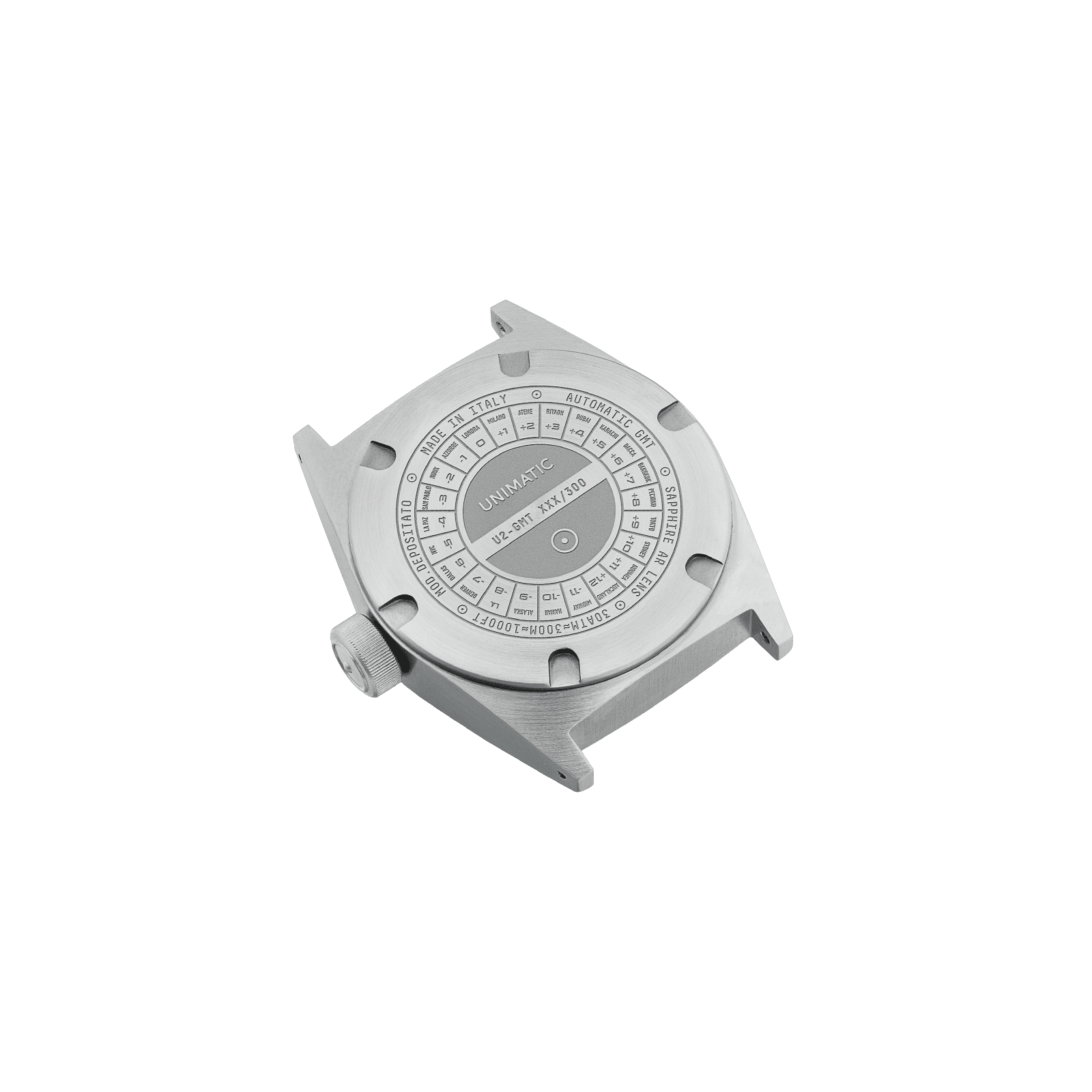 The caseback is engraved with UNIMATIC Timezone graphics and the individual progressive serial number. This timepiece is covered by a 24-month worldwide warranty.