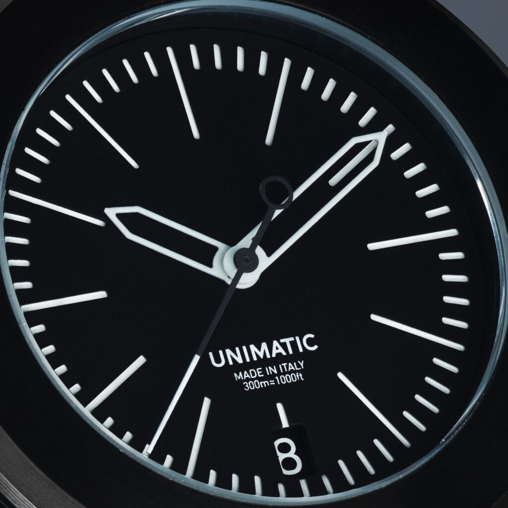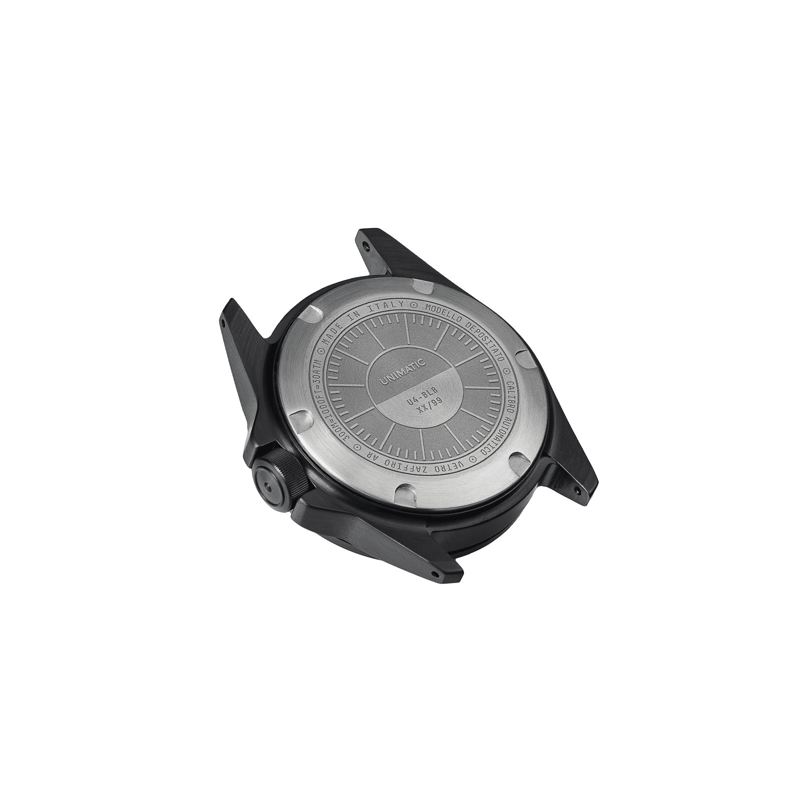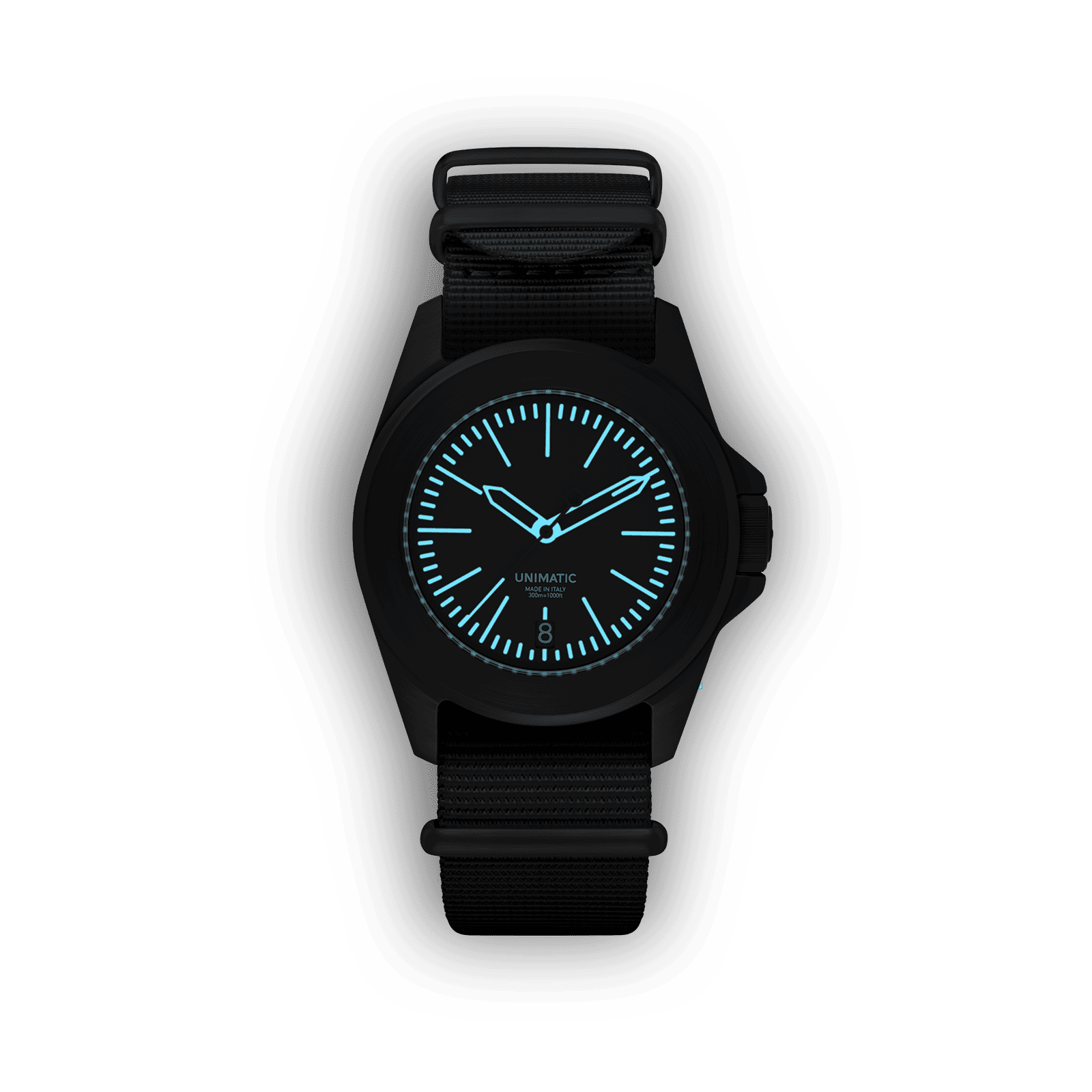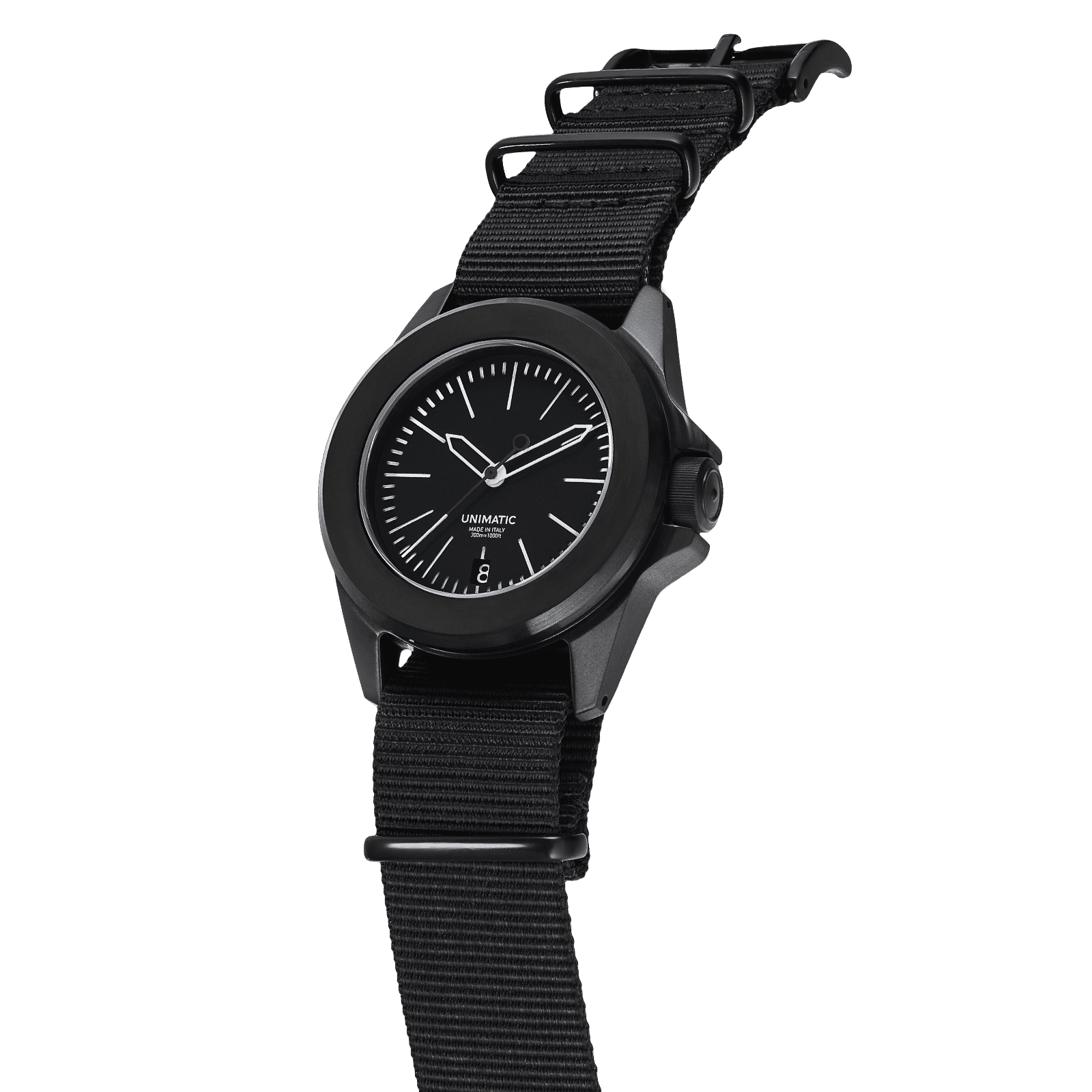 The U4-BLB comes on a black nylon NATO strap with black DLC brushed stainless steel hardware signed UNIMATIC. The caseback features an Index engraving and the individual progressive number, making each watch unique.