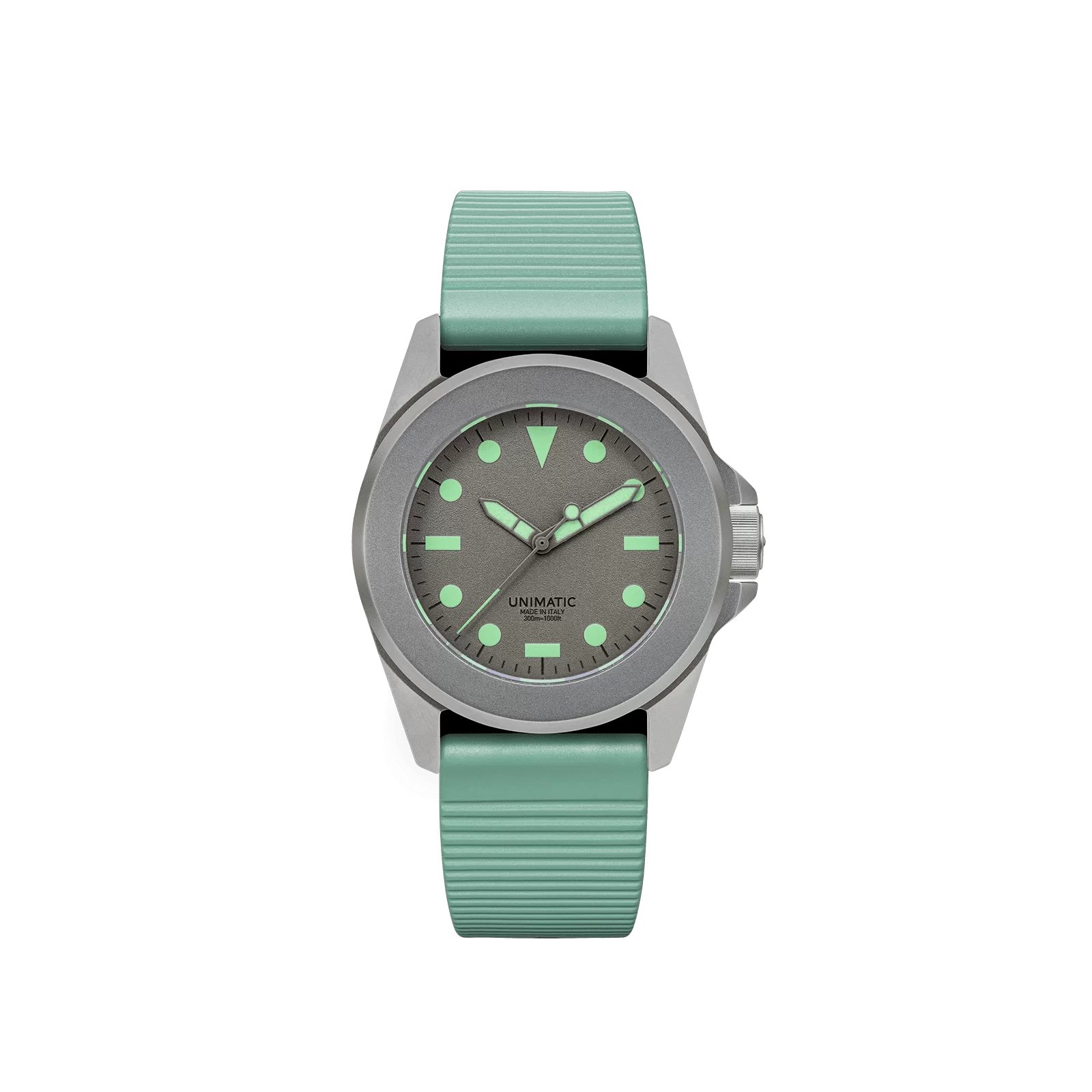 Edition of 75Ref: UWK-U4S-HGAs part of the Earthform Collection in collaboration with Huckberry, this Modello Quattro ref. U4S-HG draws inspiration from colors and textures from the natural world, the soft teal lichen that grows all over Yosemite. It features a gray grené dial with Super-LumiNova®C5 and cool gray open second rail and dial trims.