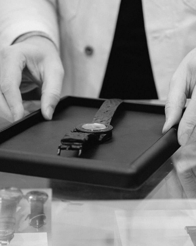 The phantom hands-set matches the dial color scheme, as the black engraved twenty-four hours bezel insert. The double-domed anti-reflective sapphire crystal provides the best performance in every light condition and provides a cool blue reflex along its edge under a particular light angle.