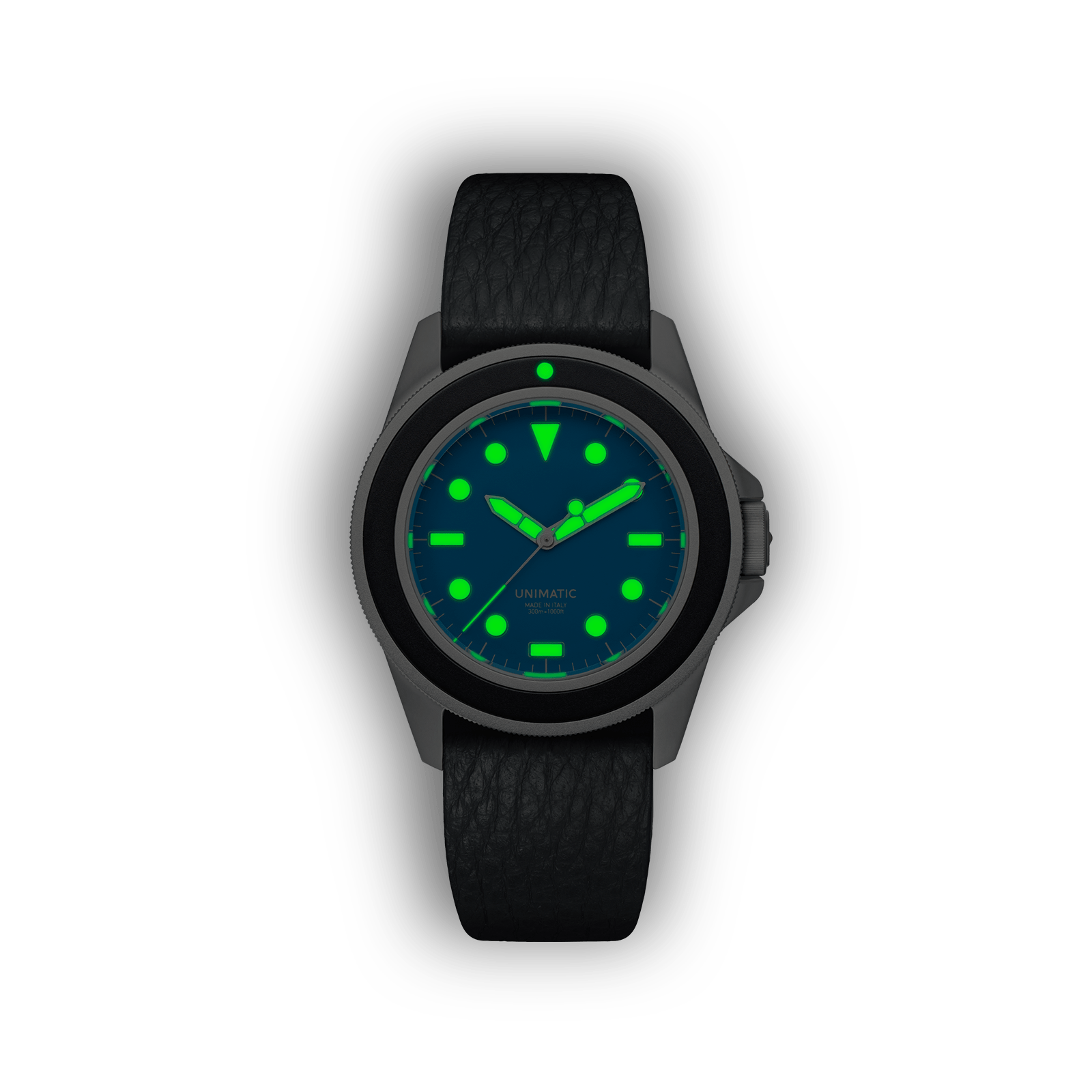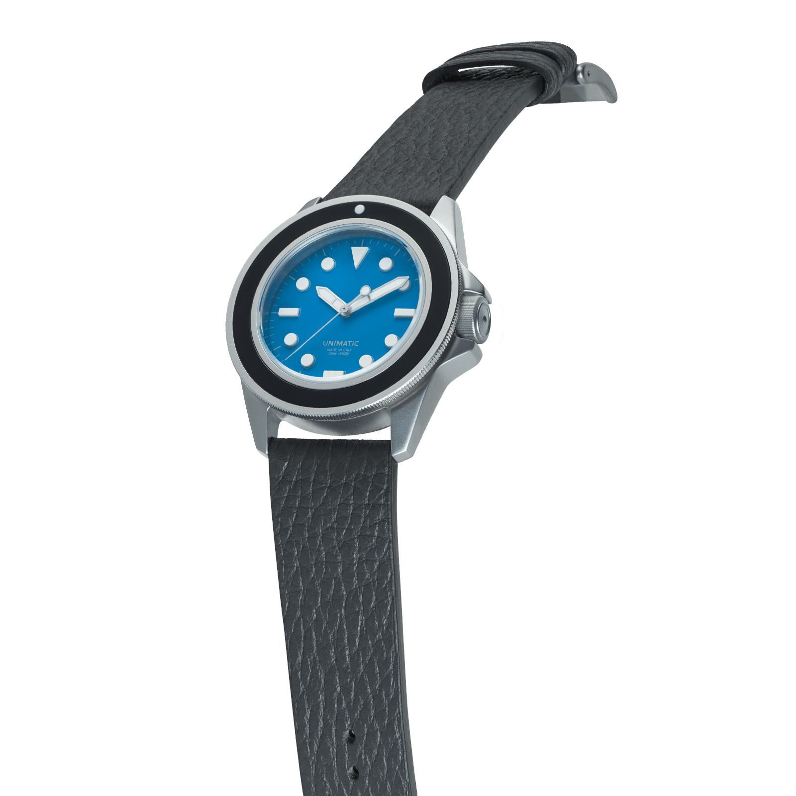 UNIMATIC Modello Uno UT1-AS is the Made in Italy quartz dive watch. It features a matte black bezel insert, Alpine sky dial with hand-applied 3D UNILIGHT markers, dark gray open second rail and dial trims.
