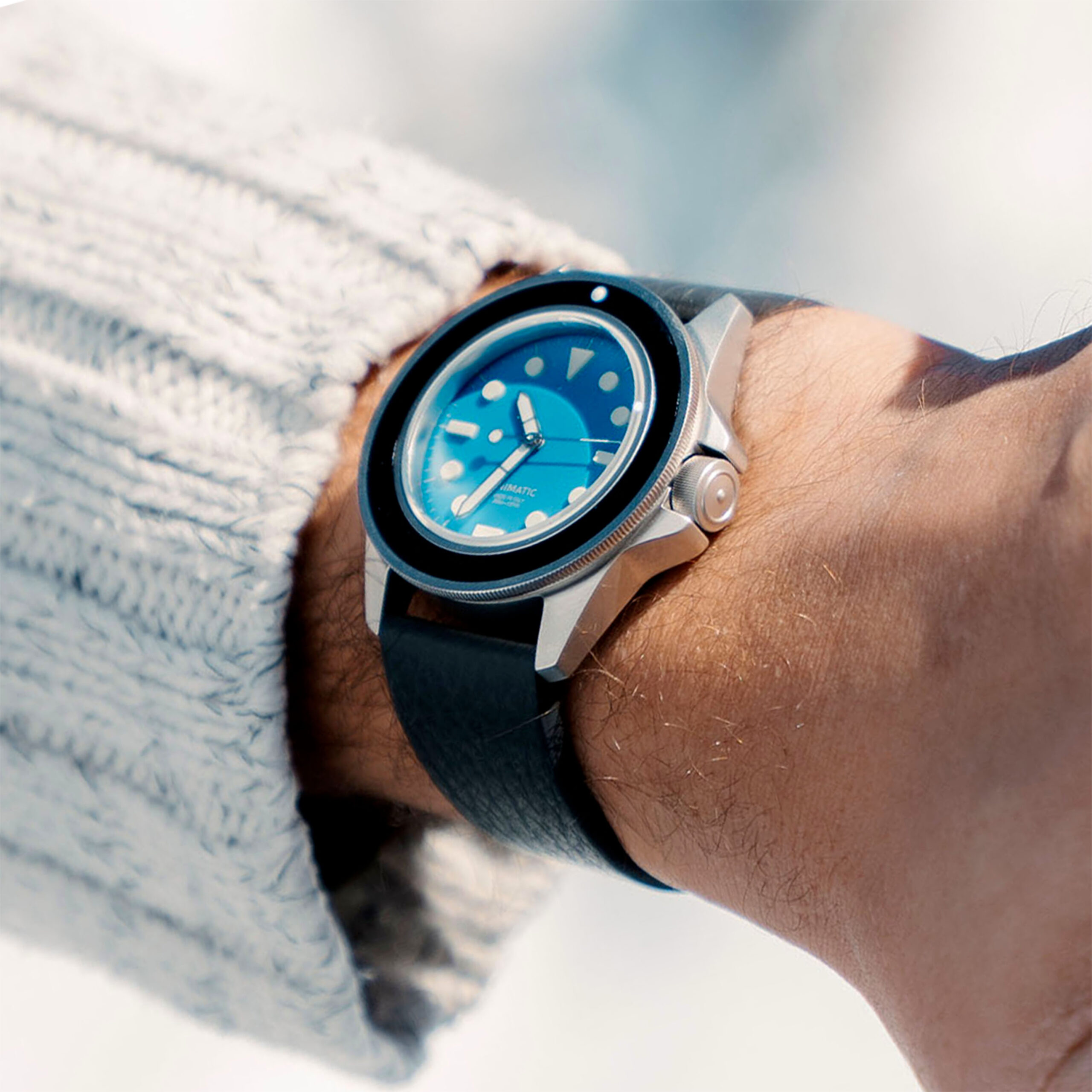 Part of the Italian Alps Collection, Modello Uno UT1-AS is inspired by the striking contrast between the vivid blue of the alpine sky and the pure white of glacier snow. Designed for demanding conditions, this durable dive watch features a crisp alpine sky dial with hand-applied 3D markers enhanced by luminous pigment for exceptional visibility.