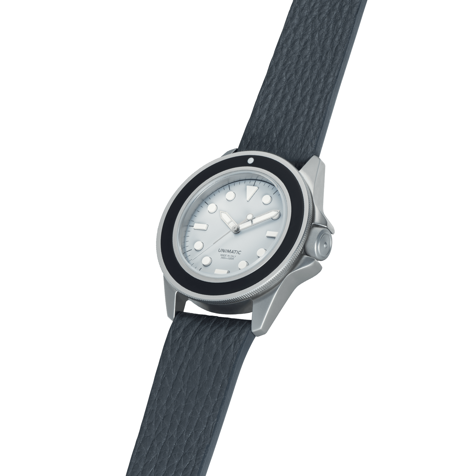It comes on a fumo deer leather two-piece quick-release strap with stainless steel sandblasted hardware signed UNIMATIC, that fits in the 22 mm lugs.